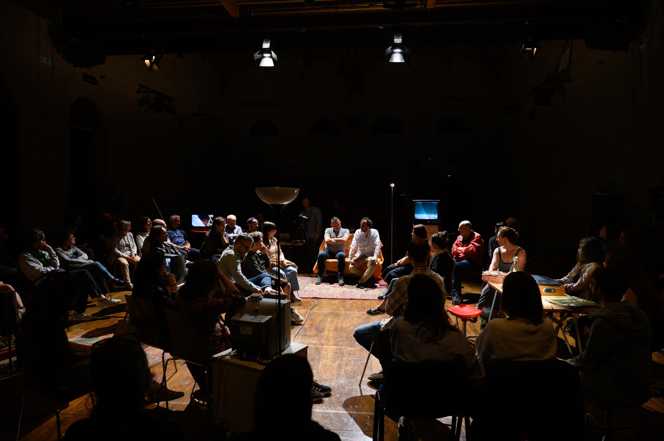The company, experimenting with a non frontal spatiality, together with devices and forms of direct and audiovisual projection, composes the performance collecting stories and images from various parts of Italy and Europe, meeting people and communities.